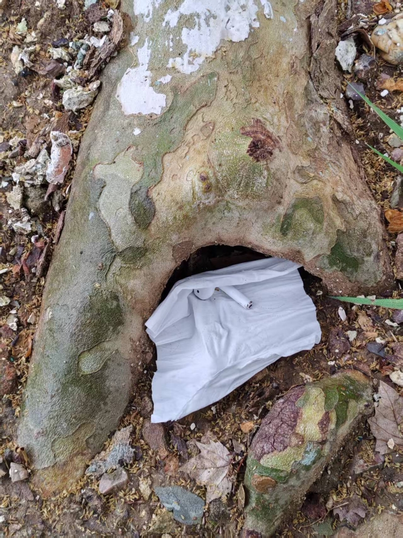 路上看见一个耳机我把它放在树洞底下了,可以防止进水吧,用纸裹起来了