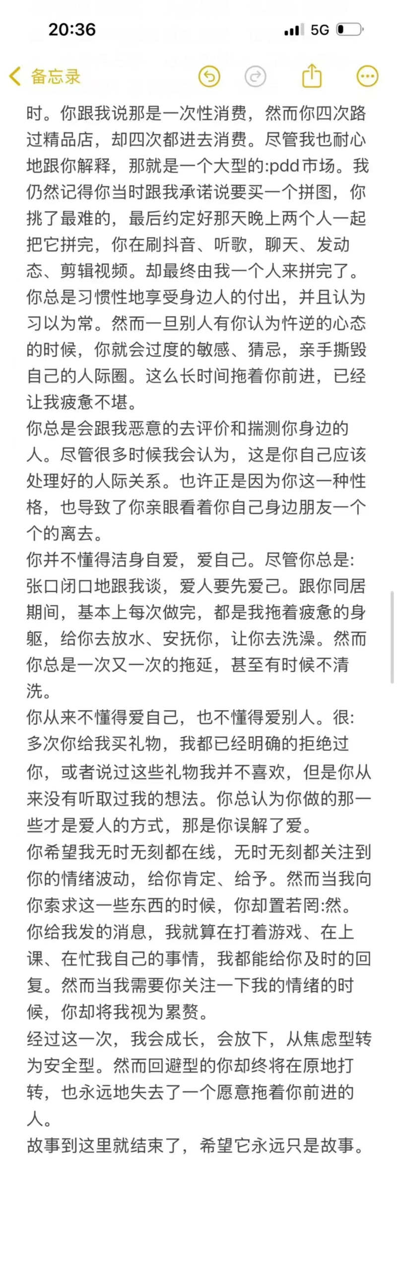 1.白纸找白纸,报纸找报纸,你一边落落大方说接受她的恋爱经历博个大度量的好名声,一边又把这些事情写出来公之于众控诉一个女孩子是什么想法?想让大家批判她不自爱?还是想体现你多心胸宽广?不要太又当又立了。 2.从你毫无底线的一再具体叙述女孩子的私生活事件以及文字语言口吻,能体现出你缺乏对待别人的尊重,毫无风度,对法律意识的淡薄,不用说谁值不值得尊重,无论值不值得,尊重他人是一种教养,被家里面惯坏了没教好吗?你以为你把女生的隐私都发出来了大家都会觉得她是个“dàng妇”?大家会随着你的心意被你带动着网暴这个女生?实则一点都不体面,很简单,从你分手后破罐子破摔的一系列无下线行为,只会让更多人了解,你,是一个什么样子的人,连如此详细隐私都可以随意传播,我相信不管是男生或者以后你自己的女朋友知道你的为人,也定然不会再与你交心,毕竟回旋刀不知道哪天就转到自己身上了。 3.每一段感情的交缠都说明你们是有缘分的,无论结果好坏,你别说现在你们分手闹出这笑话,你们谈恋爱的时候只会吵架没有美好的时候吗,这篇小作文口诛笔伐句句都是女生的不好,她这么不好,你又为什么选择和她在一起,又谈了那么久的恋爱。我相信你或者她单个独自生活都可以过得很好,你们选择在一起也是因为爱,干嘛要恶语相向呢。如果你真的非常气愤她的种种行为,你大可以只写她的所作所为而没必要透露别人的隐私。拜托成熟点吧,成年人了,允许你有情绪,可遇到问题处理问题如此随便轻率不考虑后果。 说实话,一个人越缺什么就会越在意什么。 (PS:冒昧问一嘴,你是哪里的人,让我避雷一下)